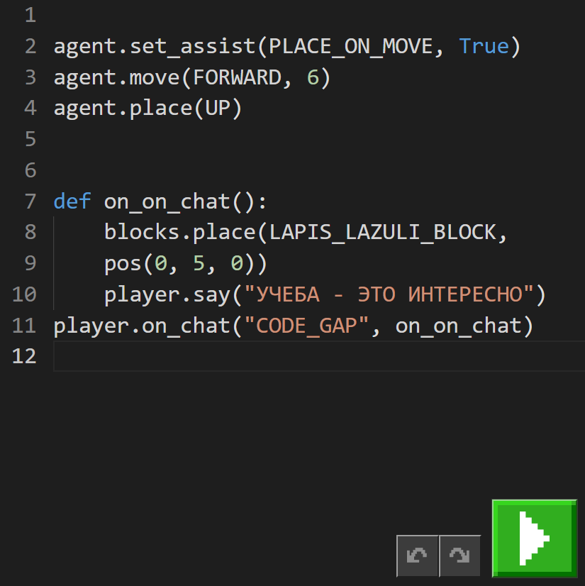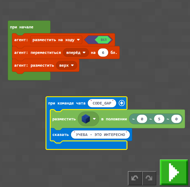 Данный курс рассчитан на детей возрастом от 7 до 10 лет и на нем мы на базе игры Майнкрафт учимся писать свои первые алгоритмы. Курс длится 8 месяцев, за которые мы изучаем не только основы, но ещё и более продвинутые темы из области программирования (Функции, массивы и прочее).